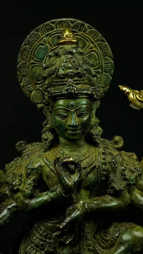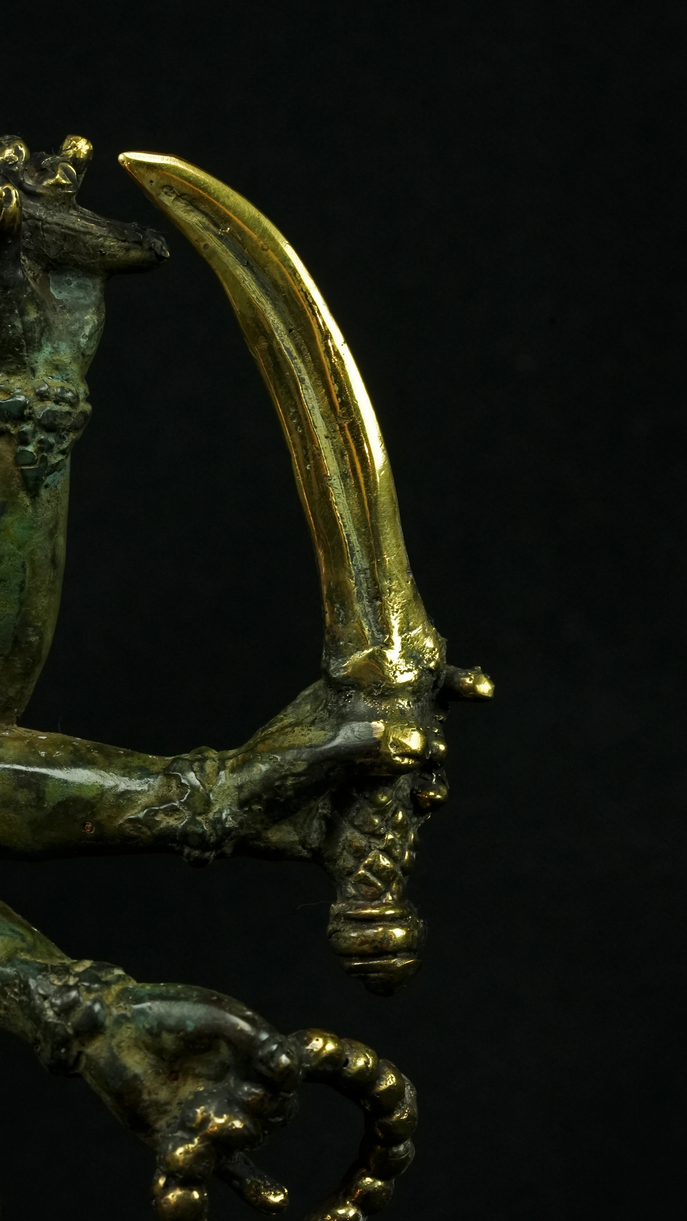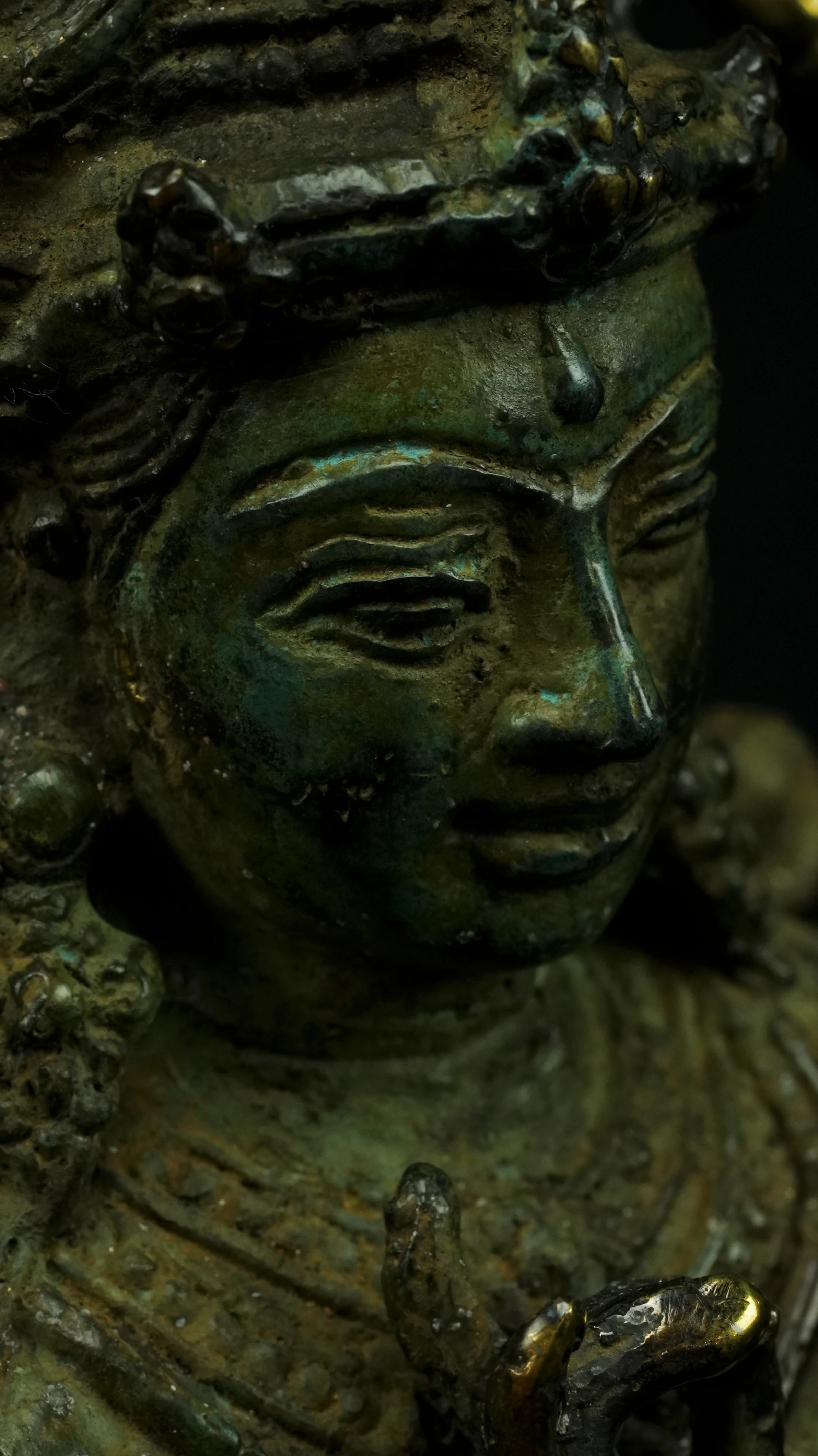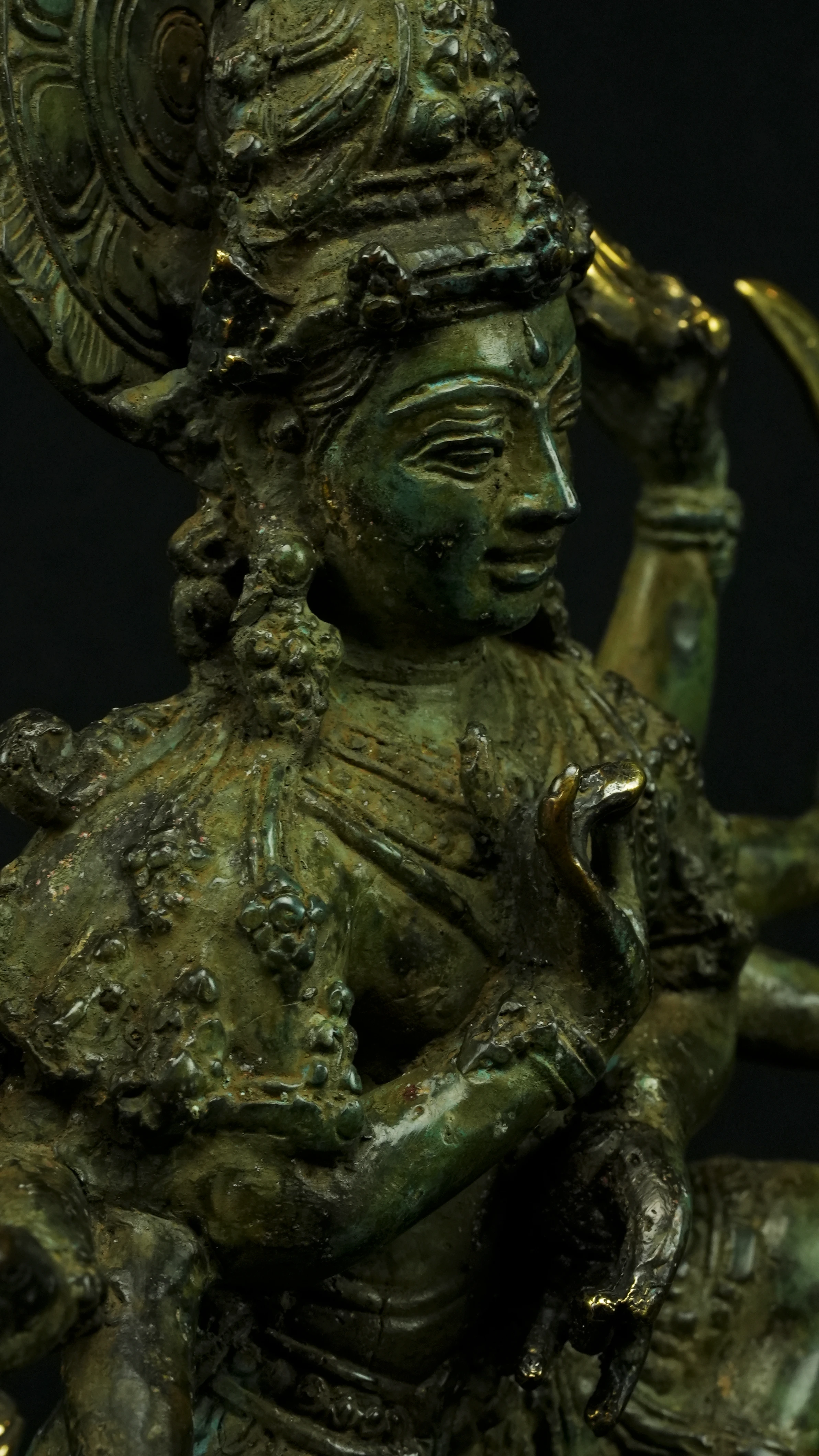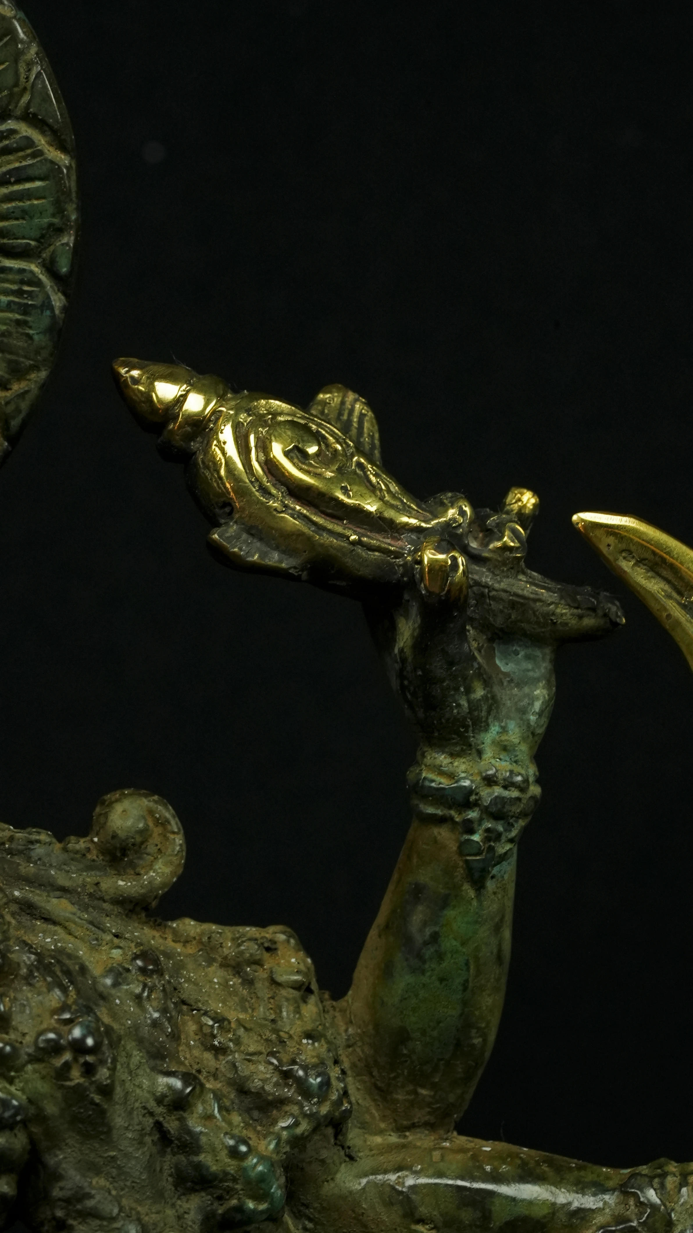 Shiva, dont le nom signifie « celle qui apporte le bonheur », est la gardienne de la vérité et la souveraine du cycle de la création, de la préservation et de la destruction. Dans cette représentation indonésienne, elle danse non pas sur le démon de l’ignorance, mais sur un lotus, symbole de pureté et de transcendance. Cette posture révèle une vérité subtile : Shiva ne combat pas les ténèbres, elle les dépasse par la lumière. Elle incarne l’état d’un être éveillé qui agit sans s’agiter, qui transforme sans détruire.