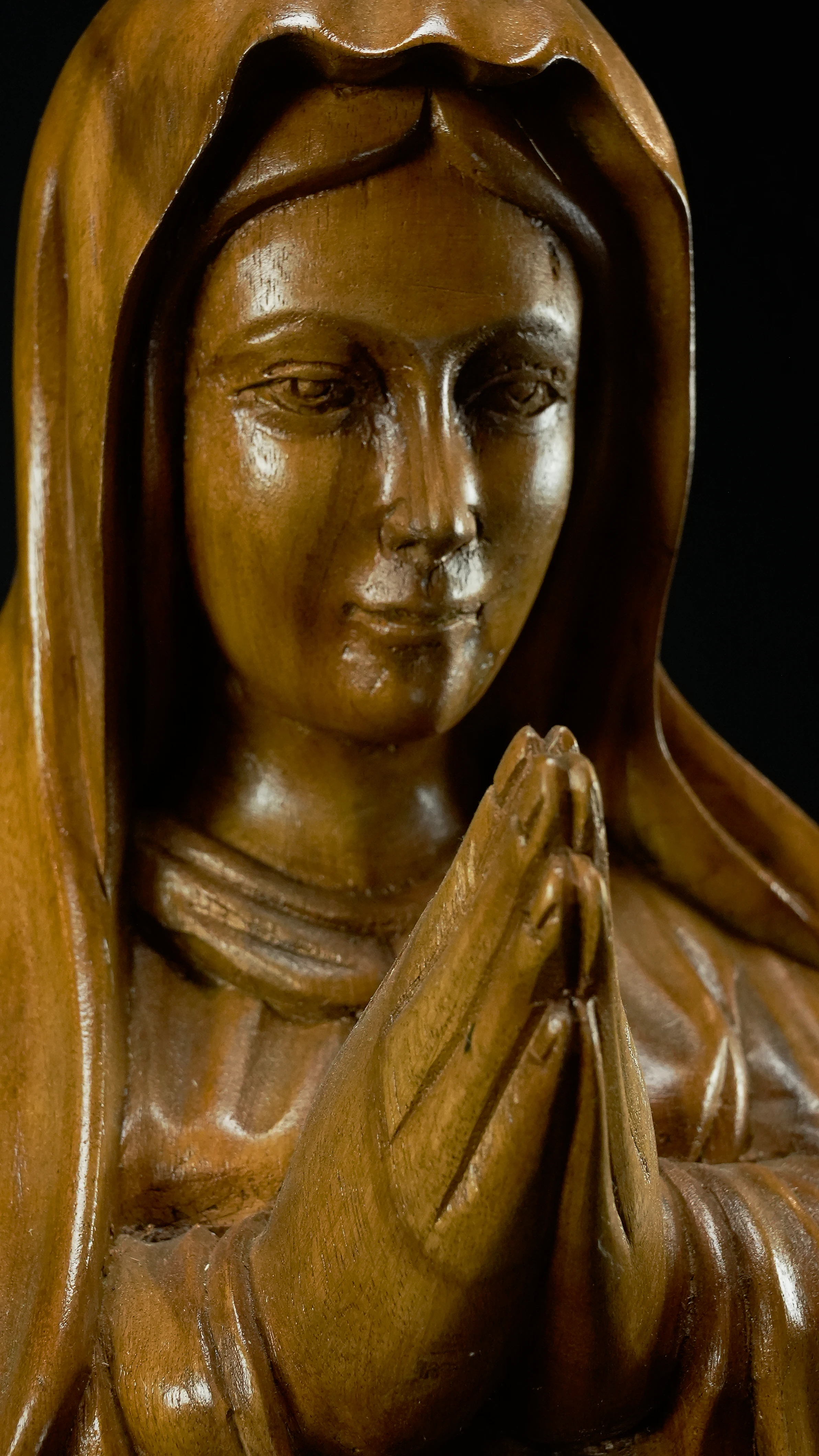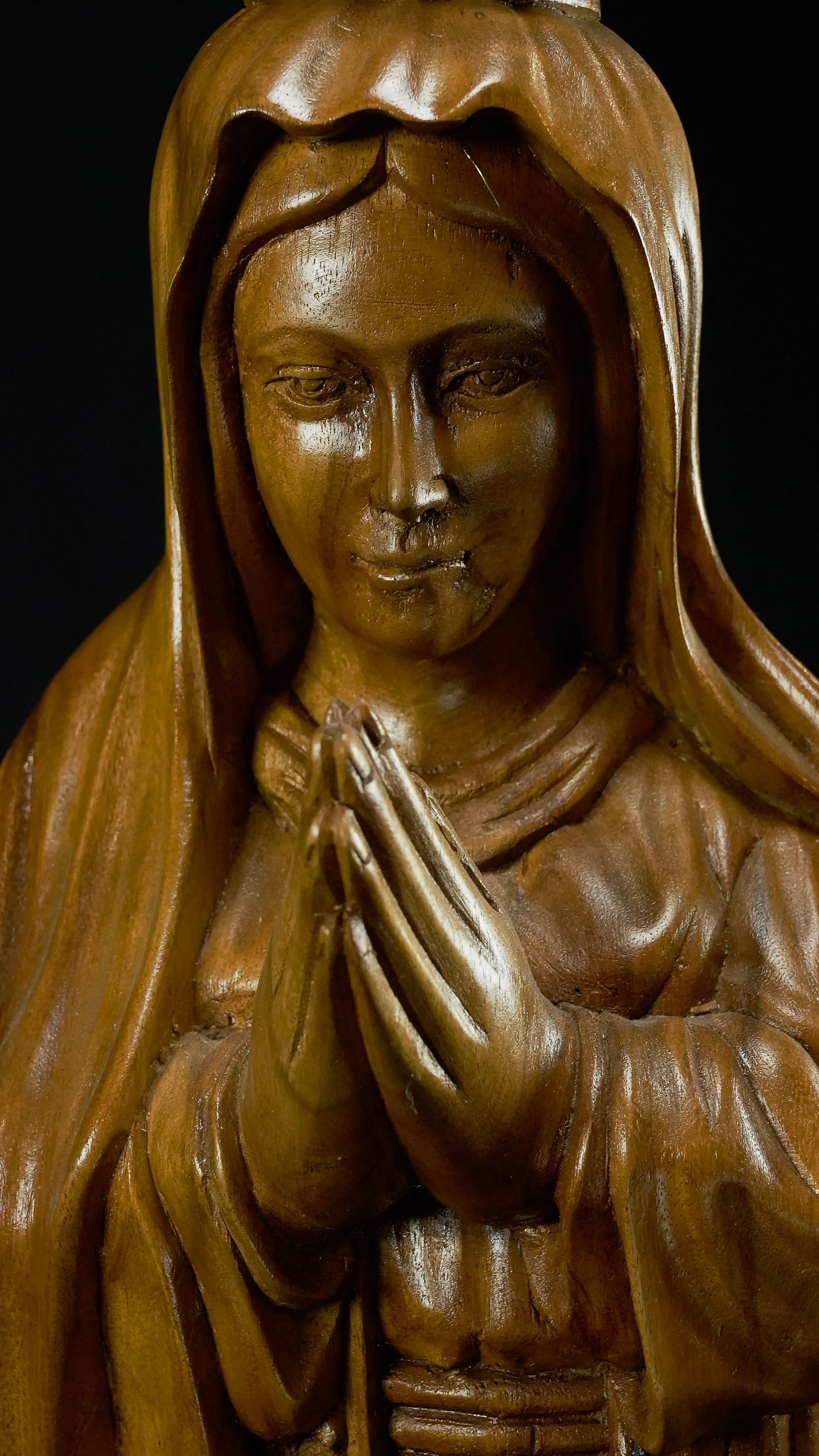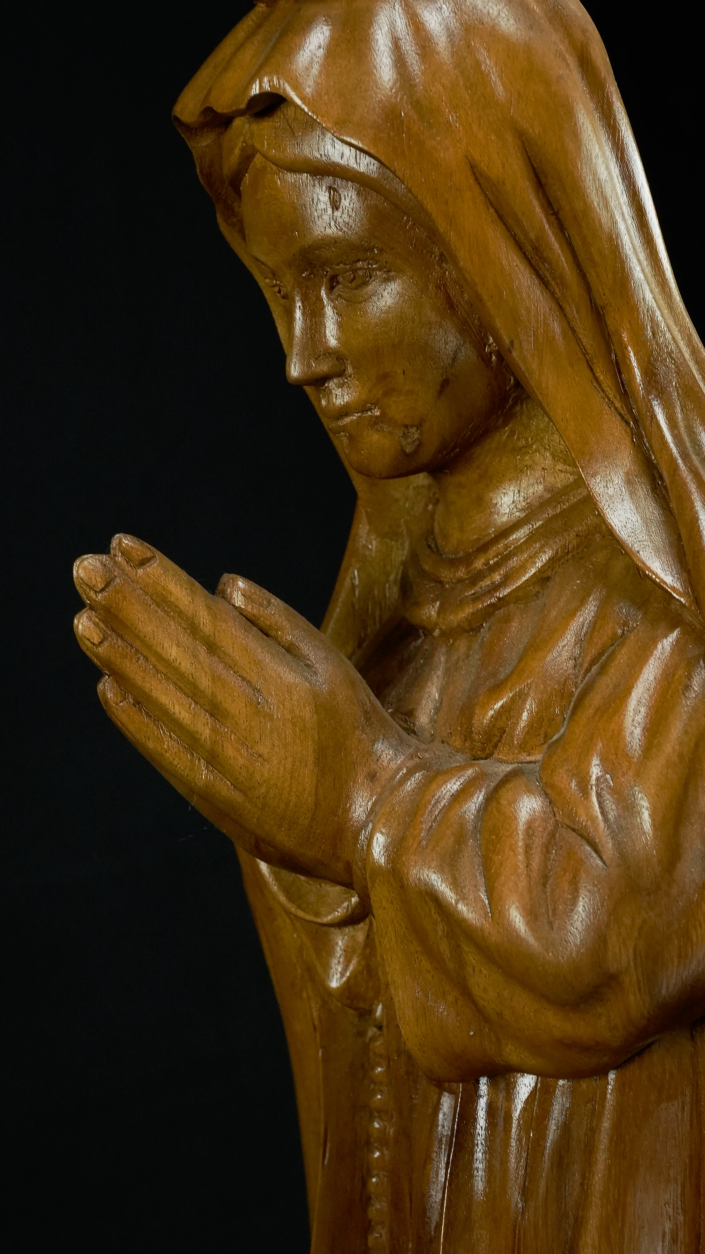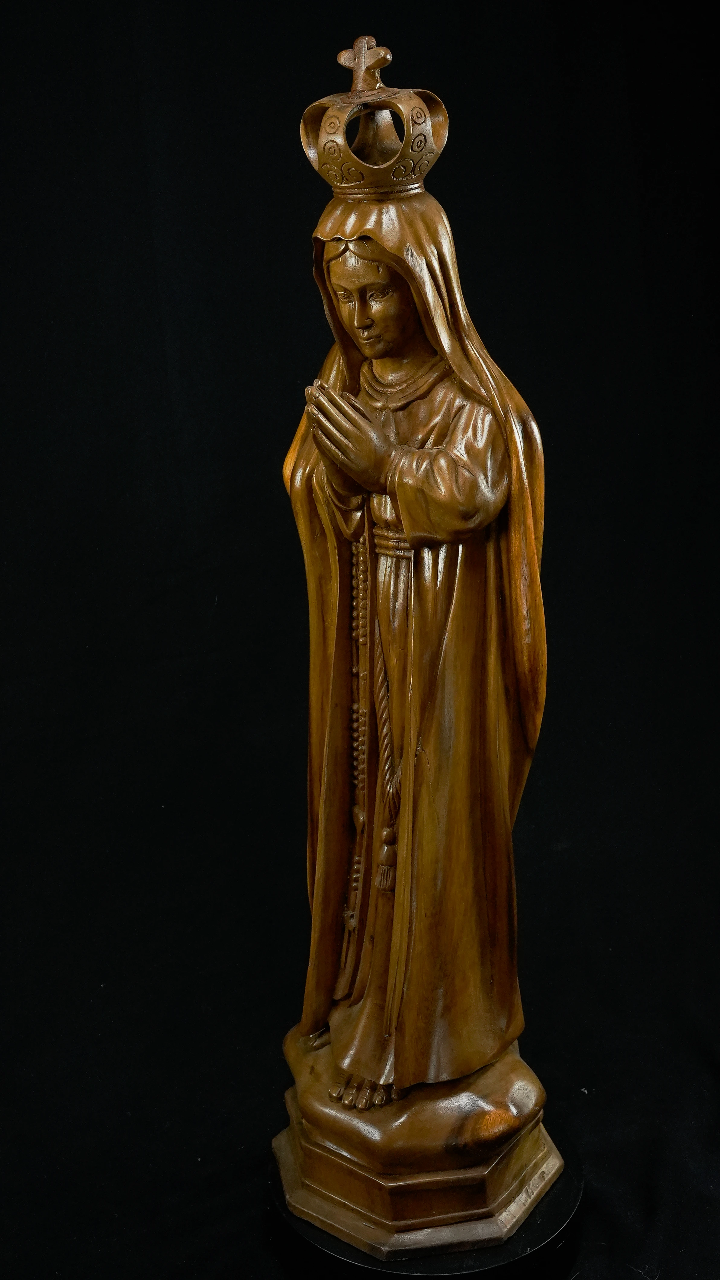 - 1x Statue avatarisée de la Vierge Couronnée en bois de Suar : 15.9 kg, 102 cm de hauteur, 27 cm de longueur, 26 cm de largeur. Réalisé à Java, Indonésie.